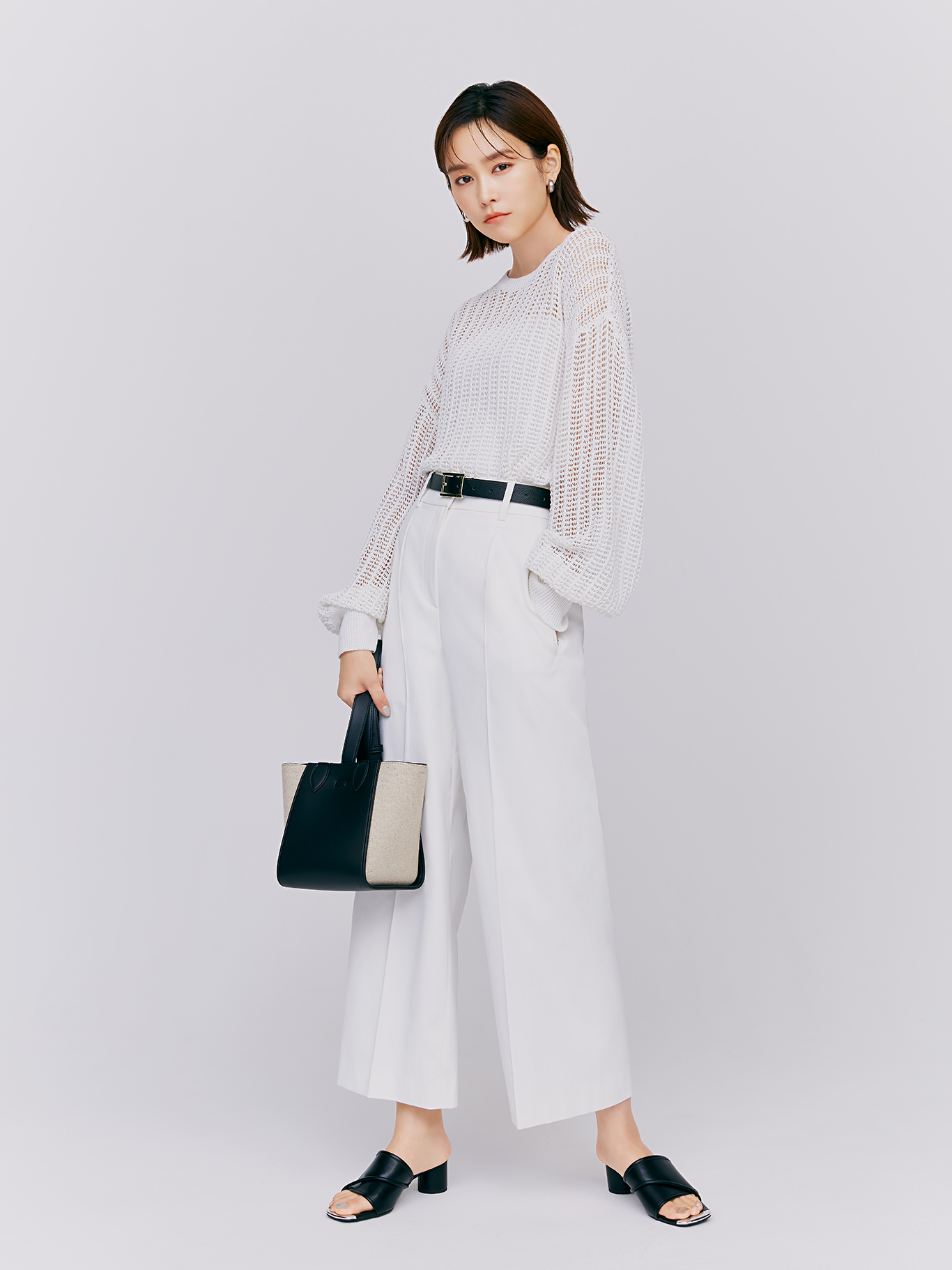 品よく、ヘルシーに、そしておしゃれに肌見せできるコードヤーンのメッシュ編みニット。合わせるワイドパンツも白で統一すれば、よりフレッシュに。