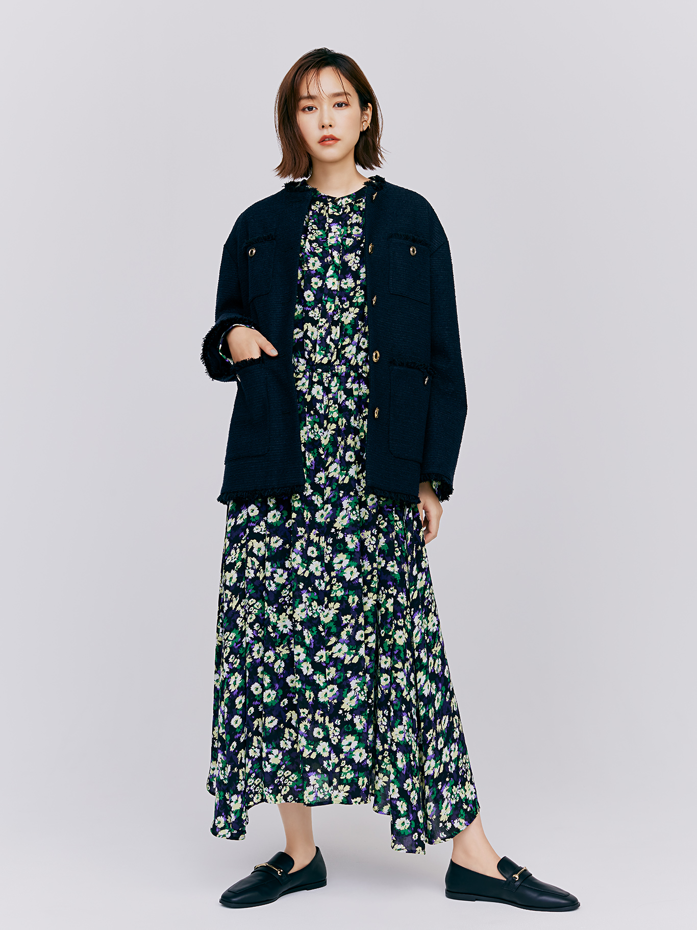 落ち着いた配色の花柄ワンピース。オーバーサイズのツイードジャケットを合わせ、甘いワンピースをあえてシャープ&ハンサムに着たい。