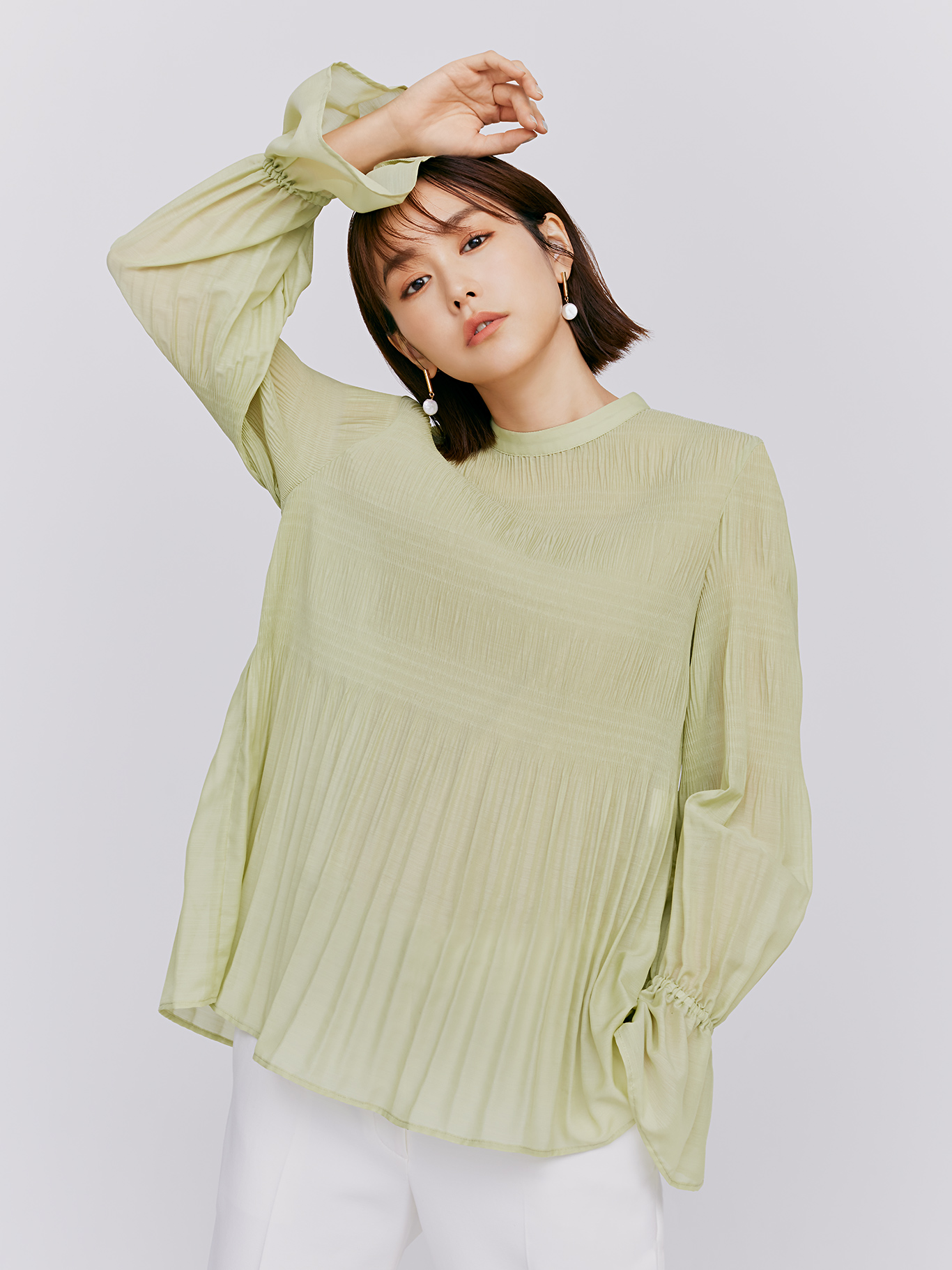ほんのり肌が透ける軽やかさ、ぱっと目を引く華やかさが魅力のマジョリカプリーツブラウス。春の注目カラー、ピスタチオを選べばトレンド感がさらに倍増。