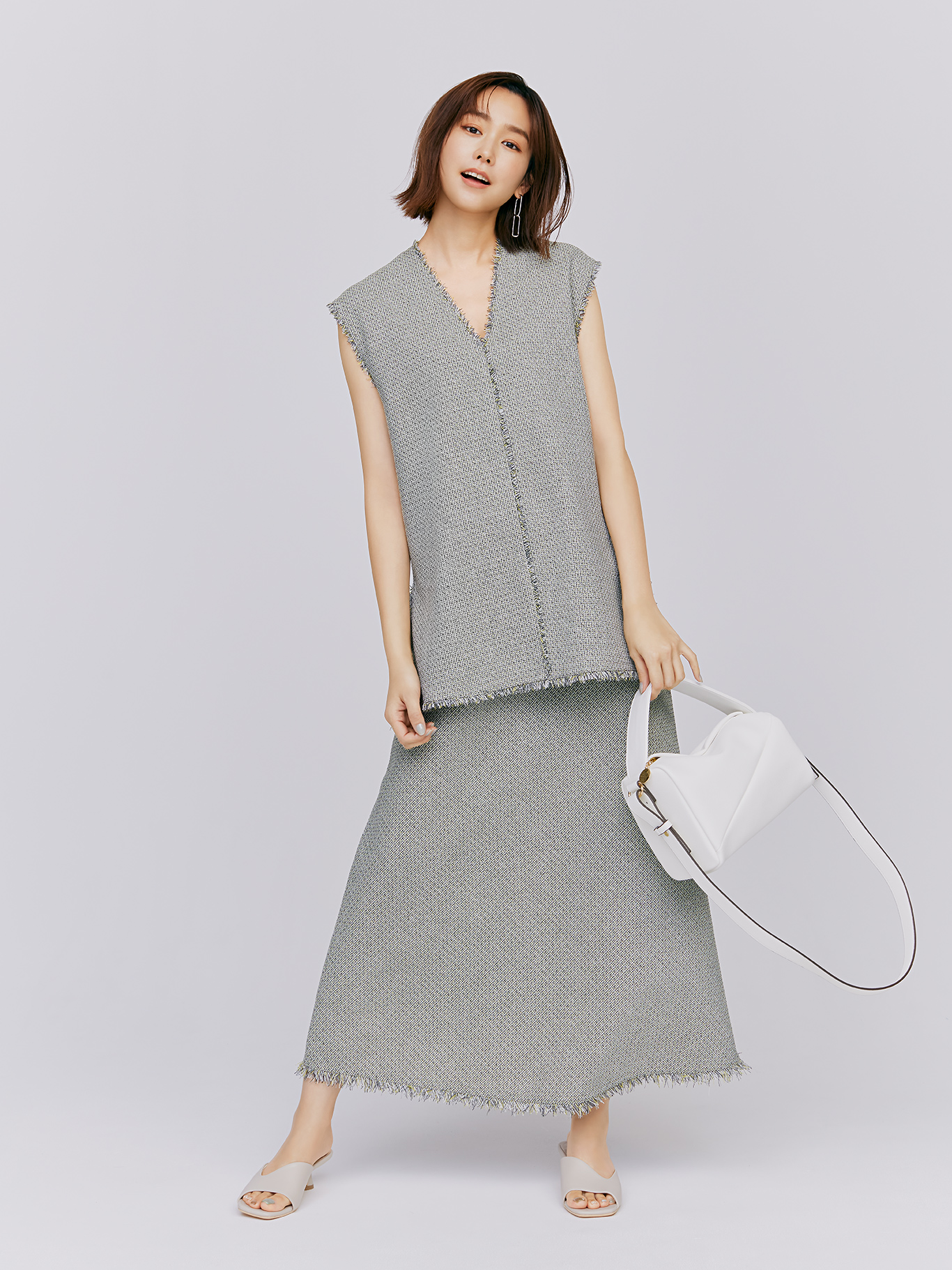 長らくトレンドの続くツイード素材は、夏に楽しめるセットアップをリコメンド。