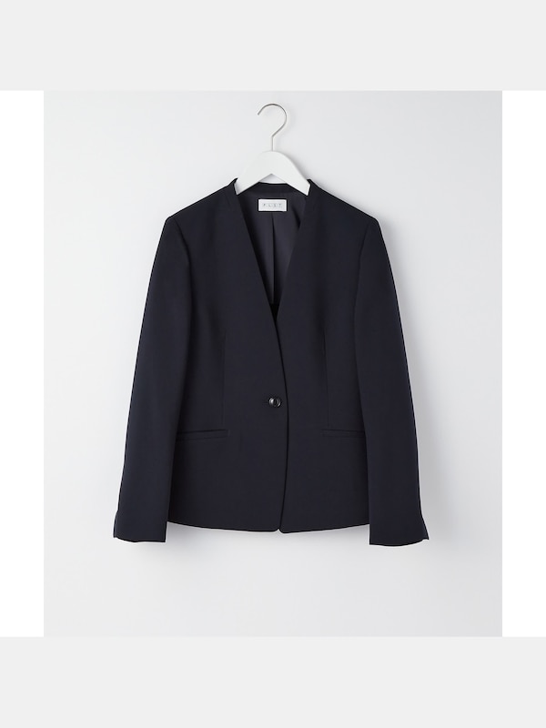 ウエストにほどよい絞りを入れたシルエット。すっきりとしたVネックのノーカラージャケット。フロントVラインをきれいに見せつつもネックの襟キザミがポイント。ワンボタン留めのフロント。袖ぐりを前寄りに設定し、動きやすい設計。袖口スリット。両サイドポケット、内ポケット付き。