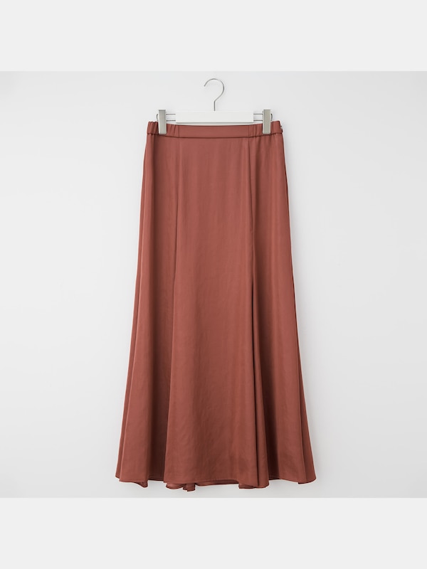 ヒップにほどよくゆとりのあるマーメードシルエットで、体型を選ばずに着用しやすいのがポイント。アシンメトリードルマンニットに合わせ、素材の質感を変えたコーディネートを楽しんでいただくのがおすすめです。