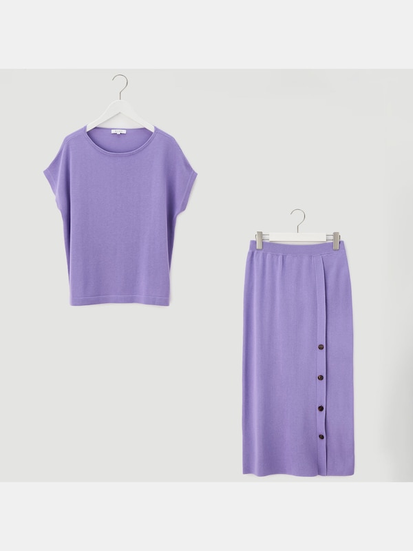 夏にも快適なドライタッチでさらりと着られて落ち感があるので雰囲気のある着こなしが簡単に決まります。セットアップではもちろん、それぞれ単品でも着回しやすいデザインがポイント。トップスはボトムスを選ばずきれいめでもカジュアルでも合わせやすく、スカートはTシャツやスニーカーと合わせた大人カジュアルなスタイリングがおすすめです。