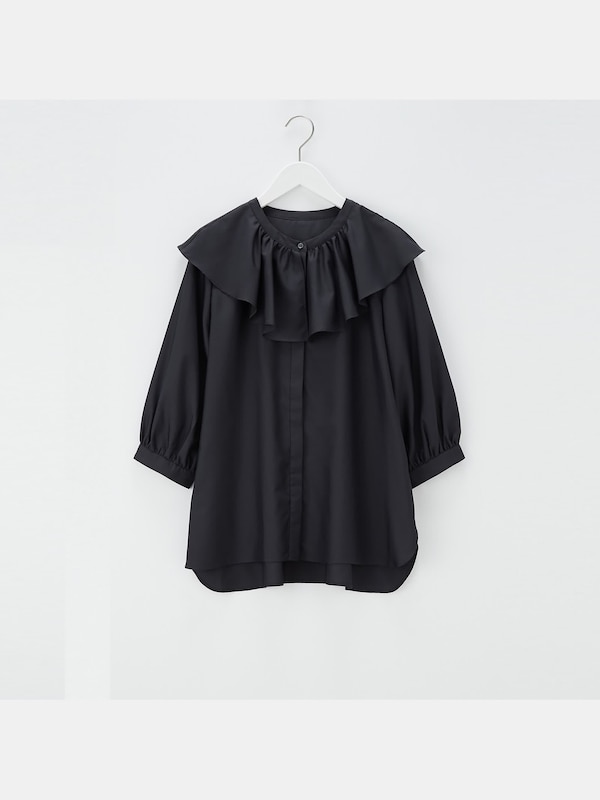 小顔効果のあるボリュームフリルで1枚で着映えするアイテムに仕上がりました。細身のパンツやワイドパンツなどモードな着こなしはもちろん、あえてデニムなどカジュアルなアイテムのはずしとして合わせるのもすてき。秋口にはニットINで襟をポイントにしたコーディネートもおすすめです。
