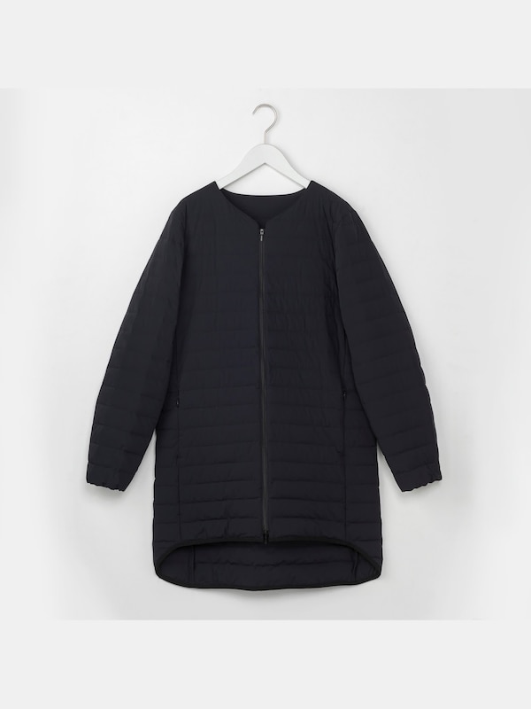 後ろ下がりのデザインで、ライトウェイトで緩やかなAラインシルエット。膝上くらいの使いやすい丈感。内側バックウエストのドロストコード付きでシルエット調整可能。窮屈感のない肩周りなど今っぽさのあるバランス。袖底にはダウンを入れないことですっきりと。ダウンが吹き出さないように開発したデザイン。ダブルファスナー仕様。