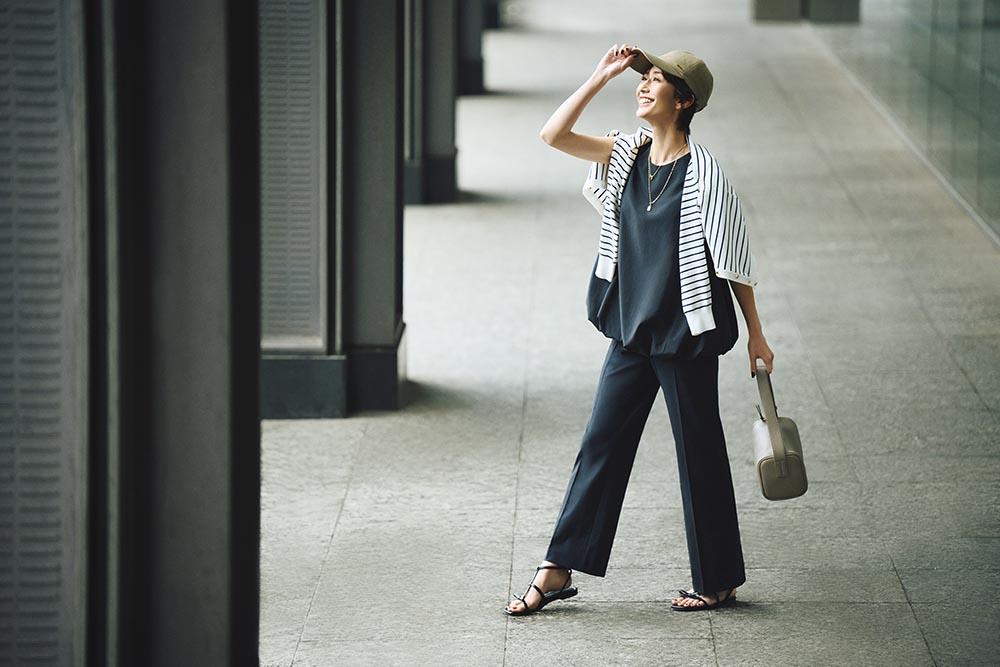 気負わないゆったり感のある異素材ミックスのトップスと、シャープなラインが美しいスティックパンツで互いの魅力を引き立てあって。