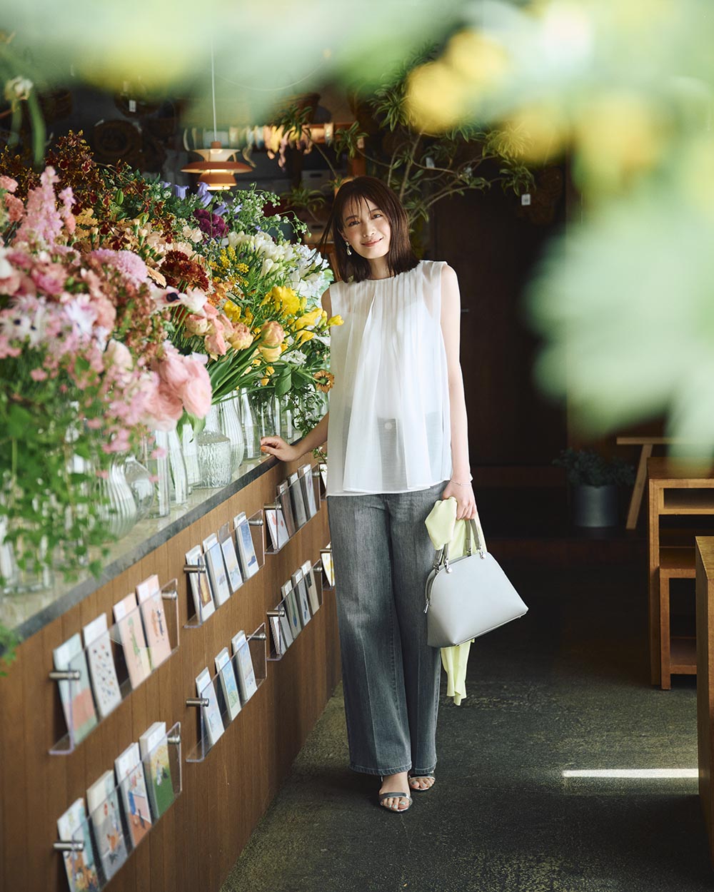 ふんわりとしたシルエットを際立たせるため、ボトムは直線的なデニムパンツを。グレーデニムも、エレガントなトップスで甘めカジュアルに。