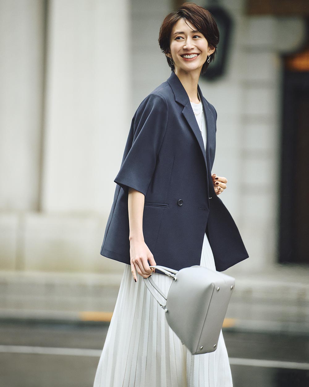 ラフ感のあるTシャツと、気品あるプリーツスカート。相反するテイストを、ヌケ感のある半袖ジャケットでつなげば、コーデがぐっとまとまり上級見え。