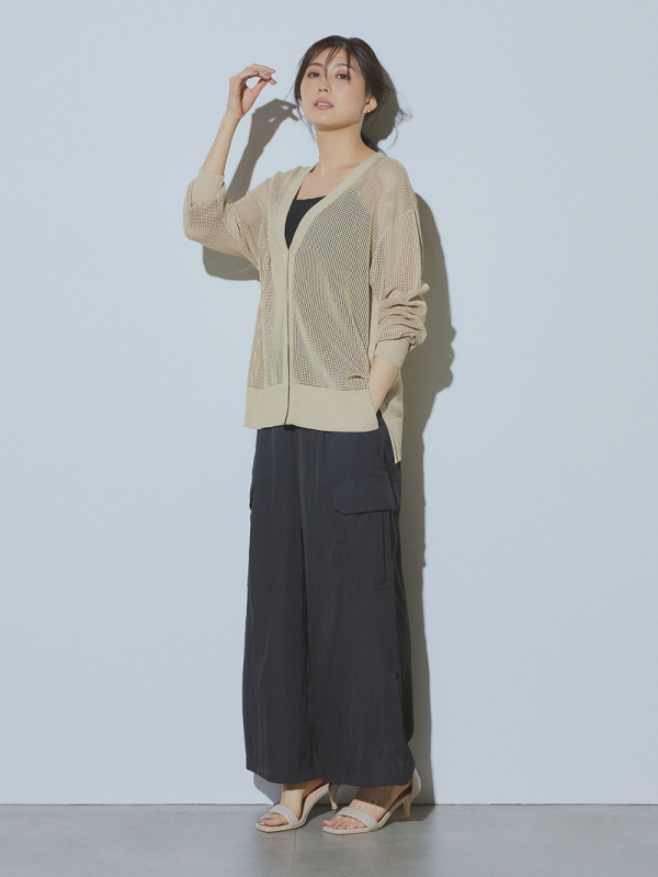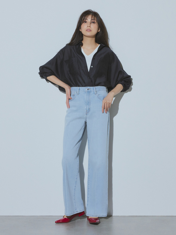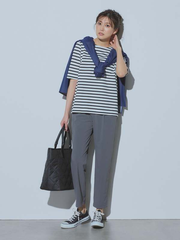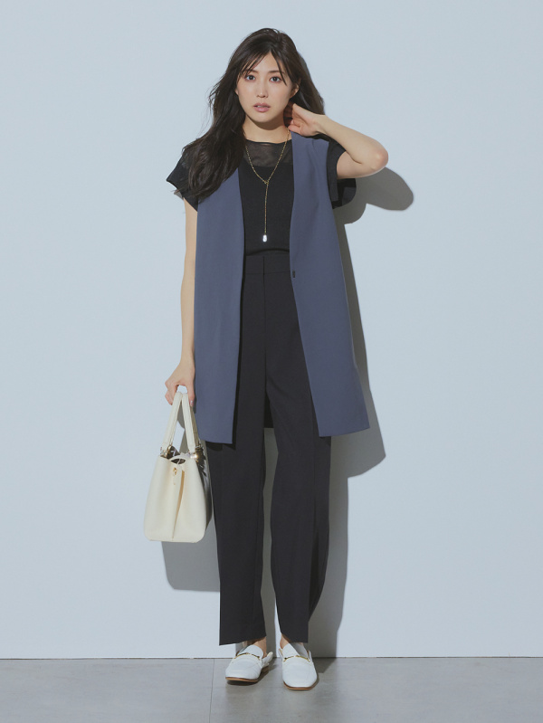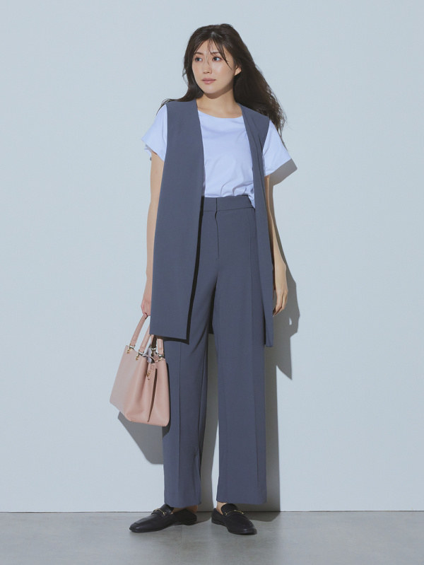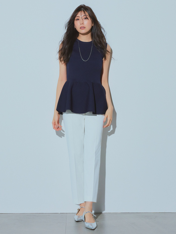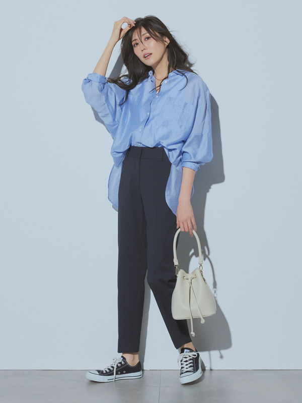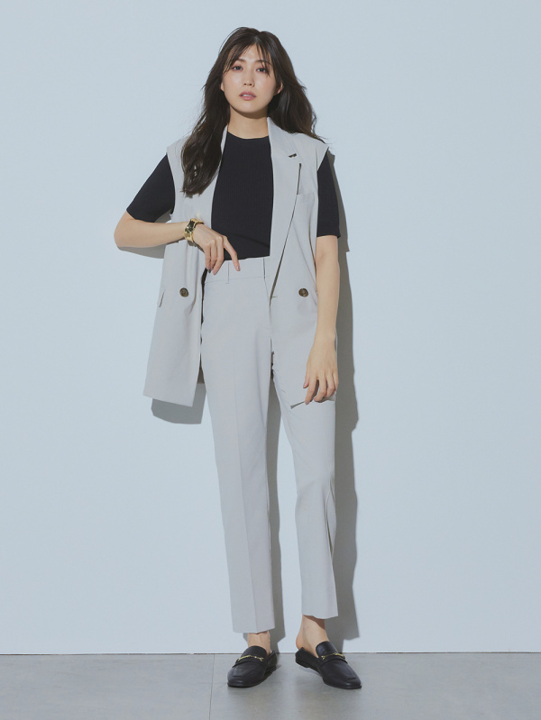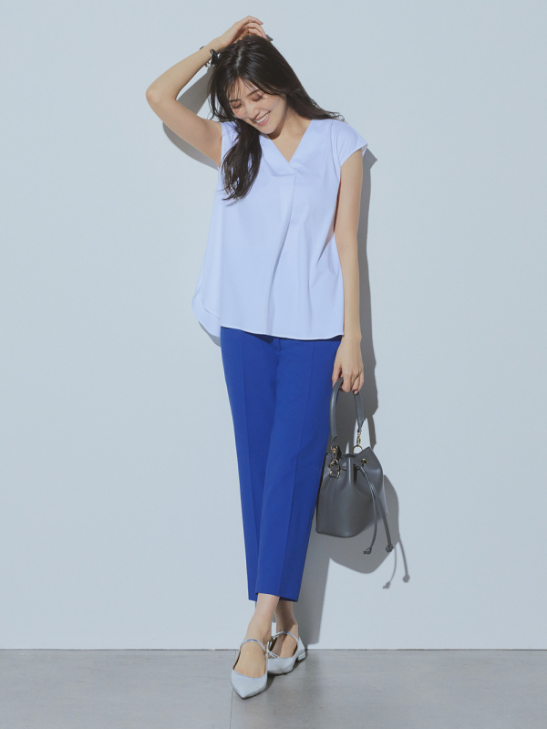 細身パンツで上半身のボリュームが強調されないよう、V開きの胸元で〝鋭角〟を。腰回りを隠すワンテクでよりすっきり。