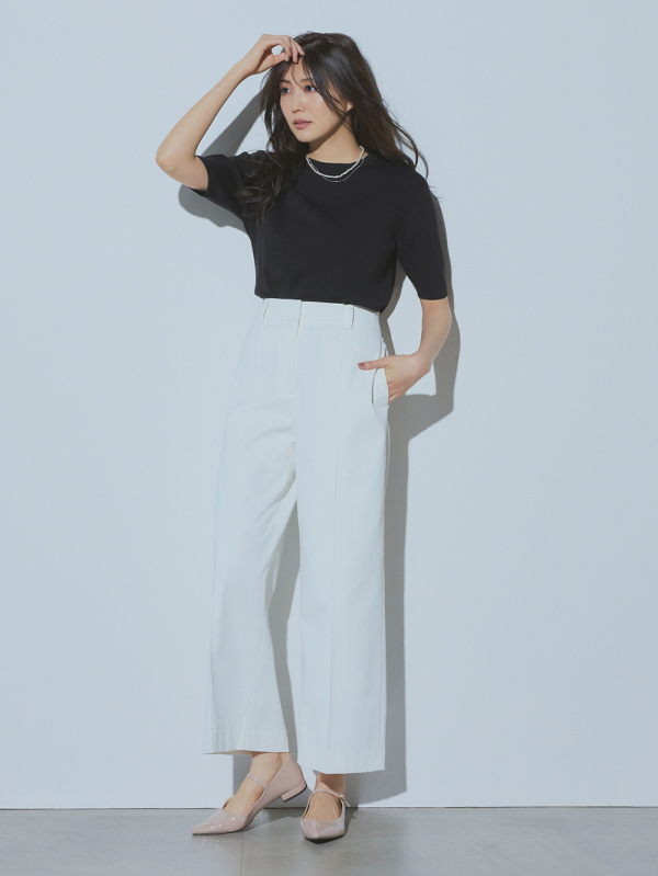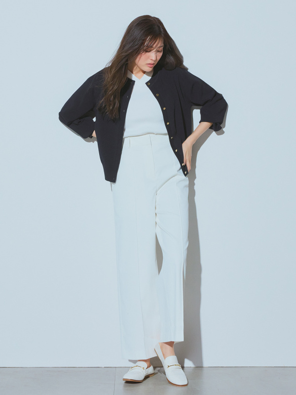 配色で緩急をつけるほどメリハリボディがシャープに引き立ちます。色の中で最も明度が高い白のパンツを味方つければ無敵!