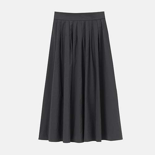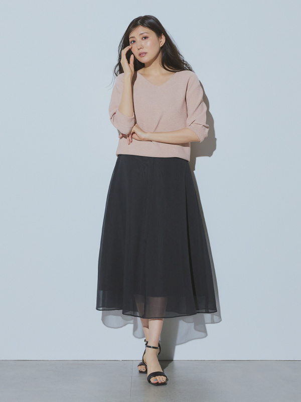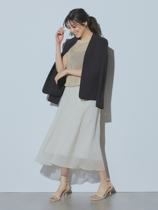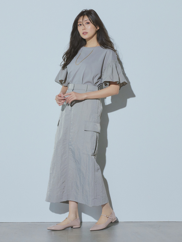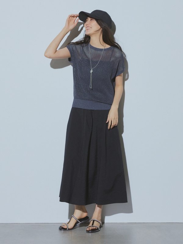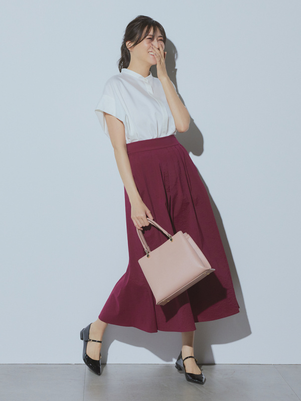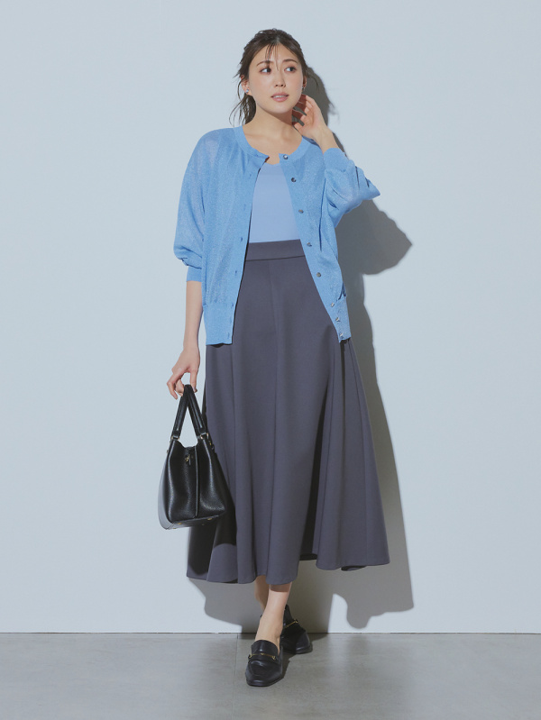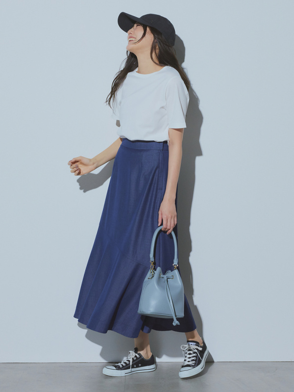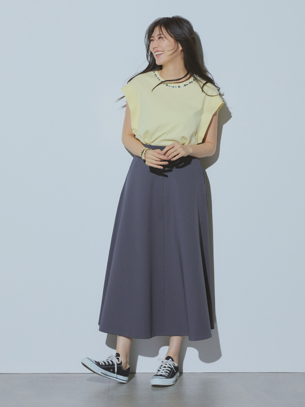 すっきり着映えるバランスを吟味して。デザイン性のあるトップスならスリムなボトムと、シンプルTならフレアスカートも相性◎。
