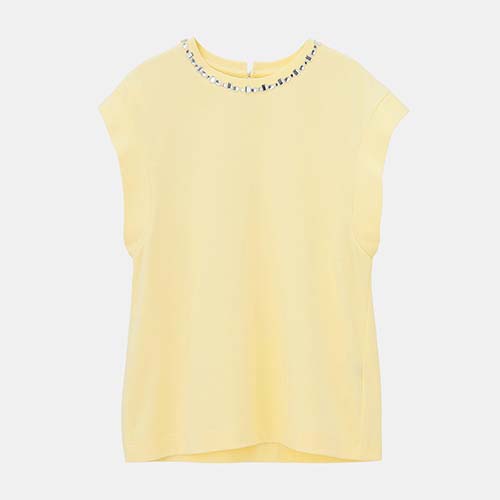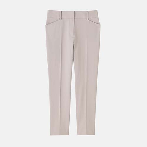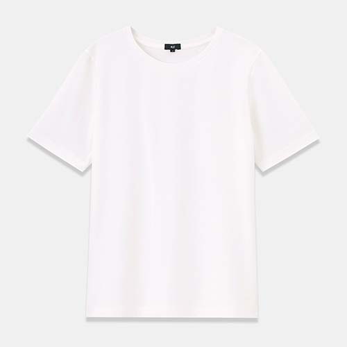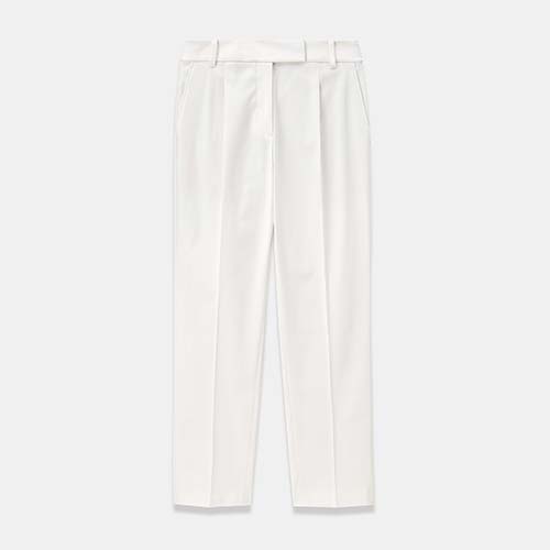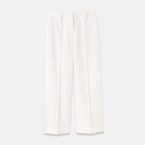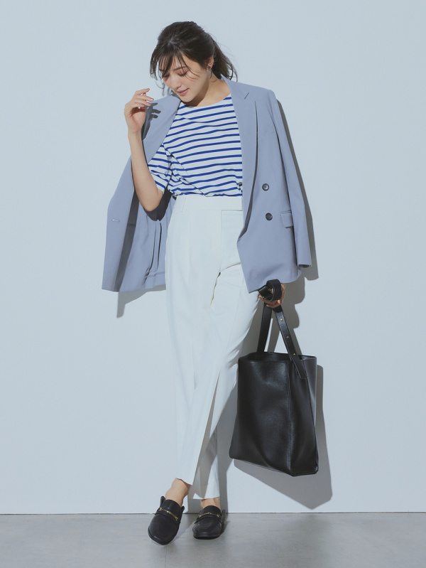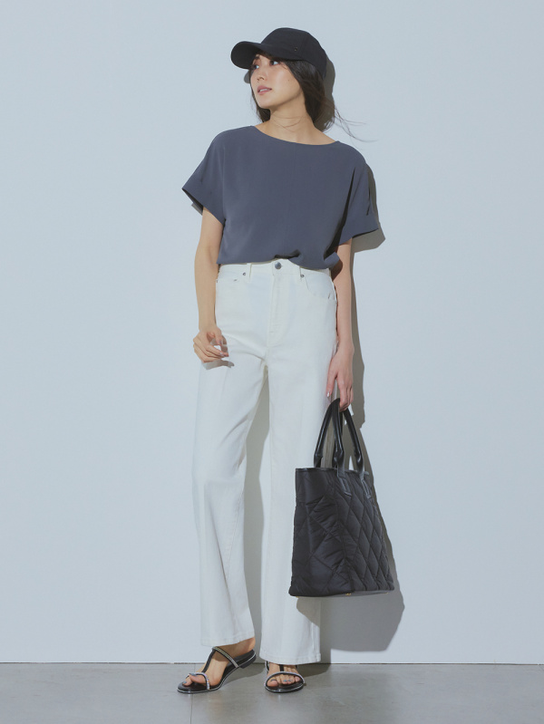 ハリ素材が似合うストレートタイプがソフトなカットソーを着る時は、キレのある着こなしがキモ。可愛いより〝きれい〟を目指して。