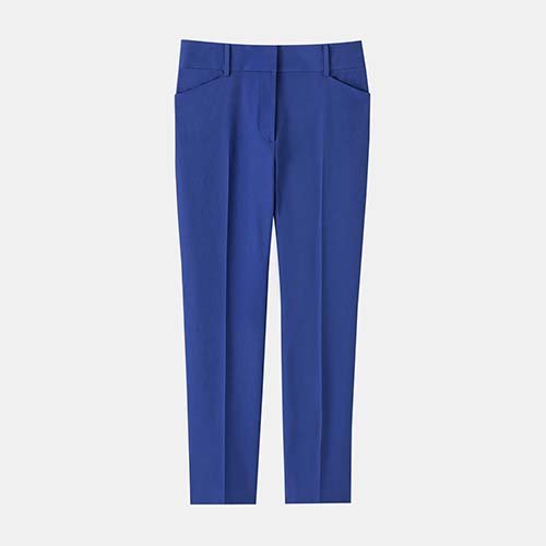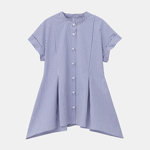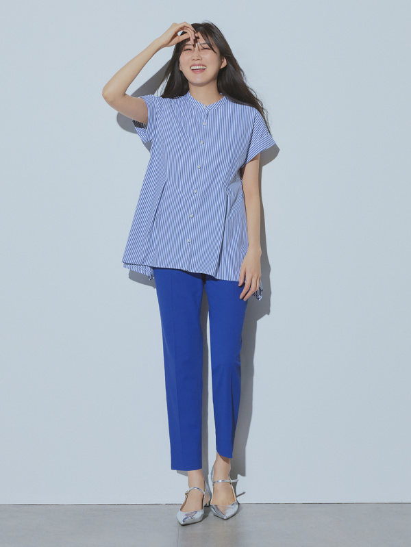 身体に丸みを感じさせないためにも、ネックラインや裾、ボトムなど、そこかしこにシャープな直線を。寒色で引き締めるのも得策!