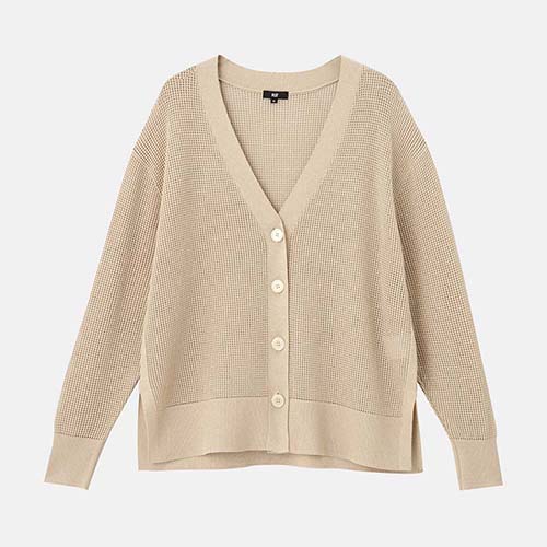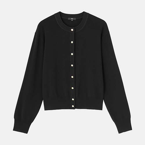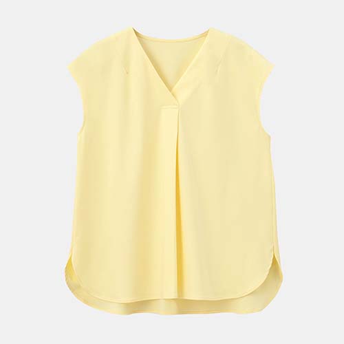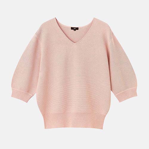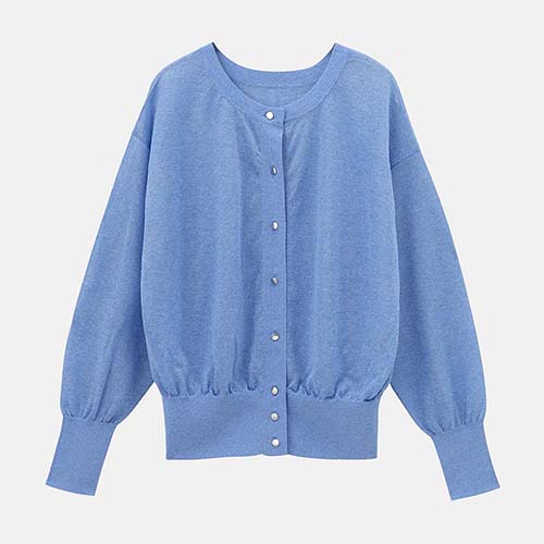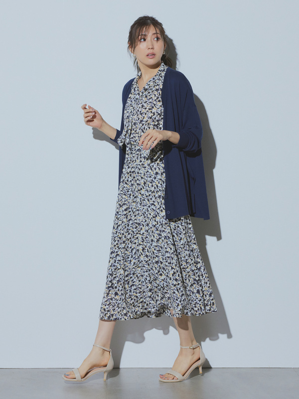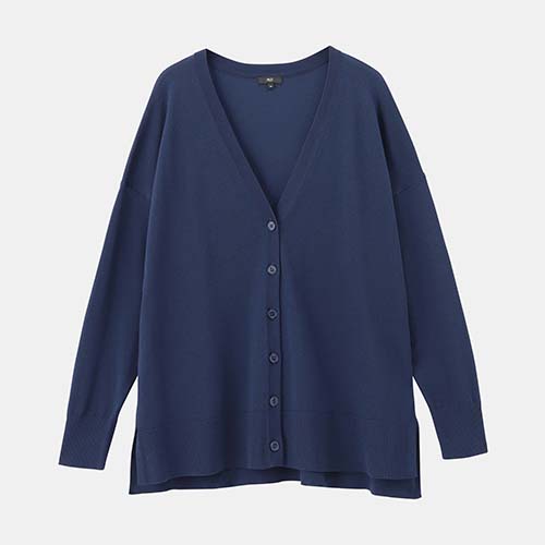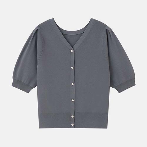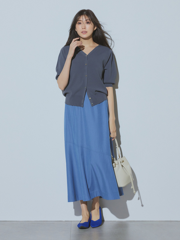 Vネックとデコルテ見せのダブルアプローチで胸の厚みをスマートにカバー。縦ラインを強調できるボタン付き前開きタイプが◎。