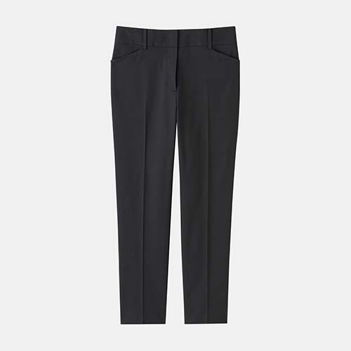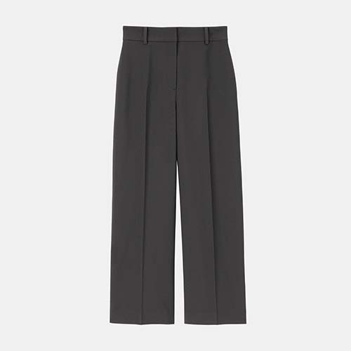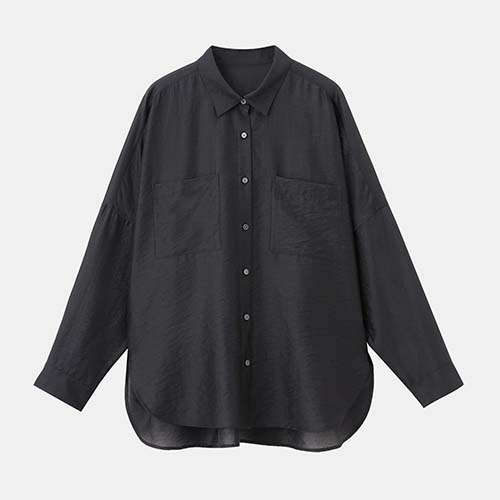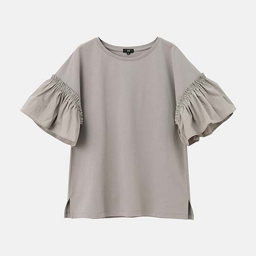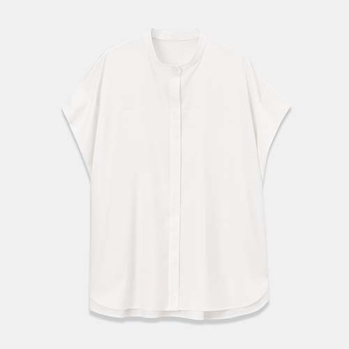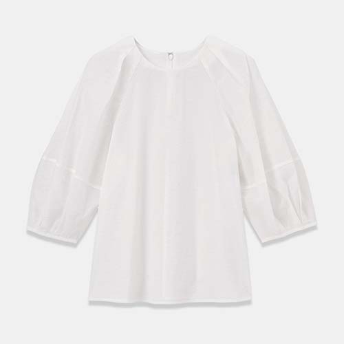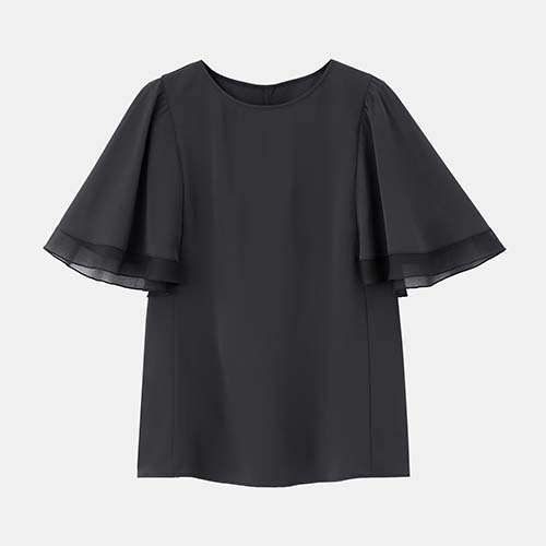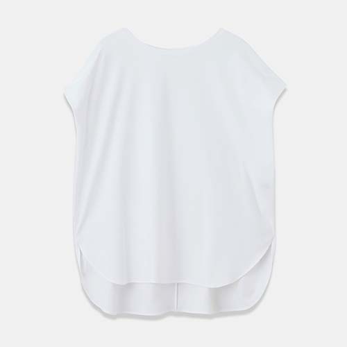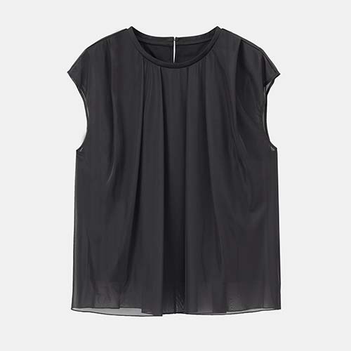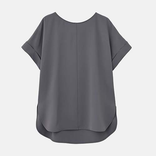 二の腕をなだらかに覆うシンプルトップスには、肩の丸み、厚みを目立たせない効果あり。濃色で格上げすると着こなしが締まって◎。
