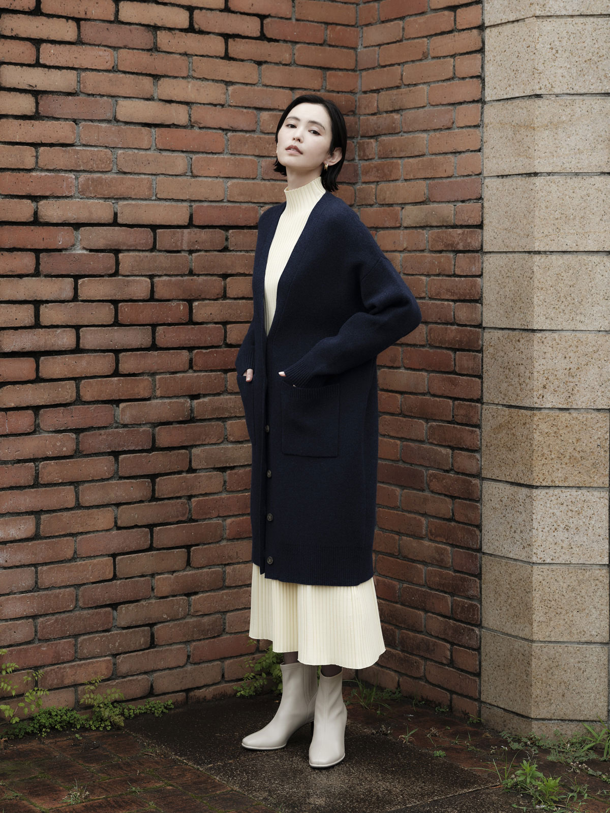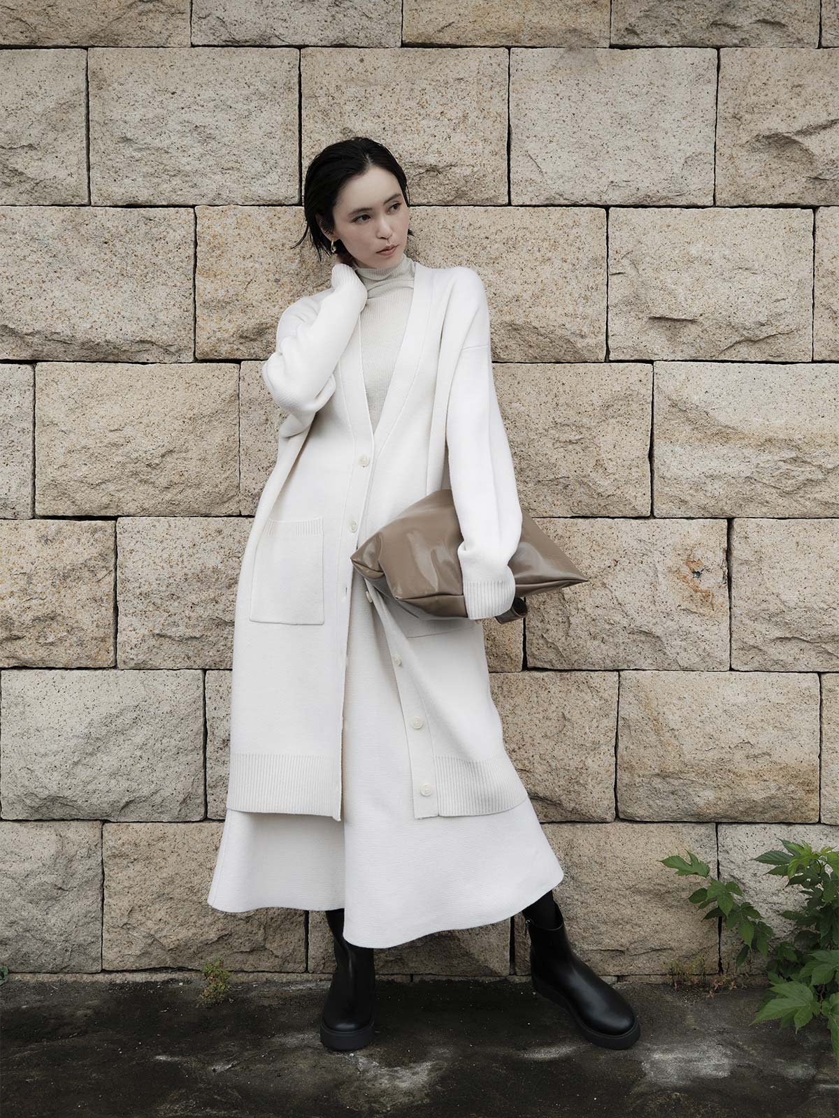 ロングカーディガンは、ライトアウターといえるあたたかさ。膝まで届くほどのロング丈で、裾にかけてややすぼまっていくシルエットが特徴。ロングのニットワンピースからワイドパンツまで、バランスのとりやすいデザインに。