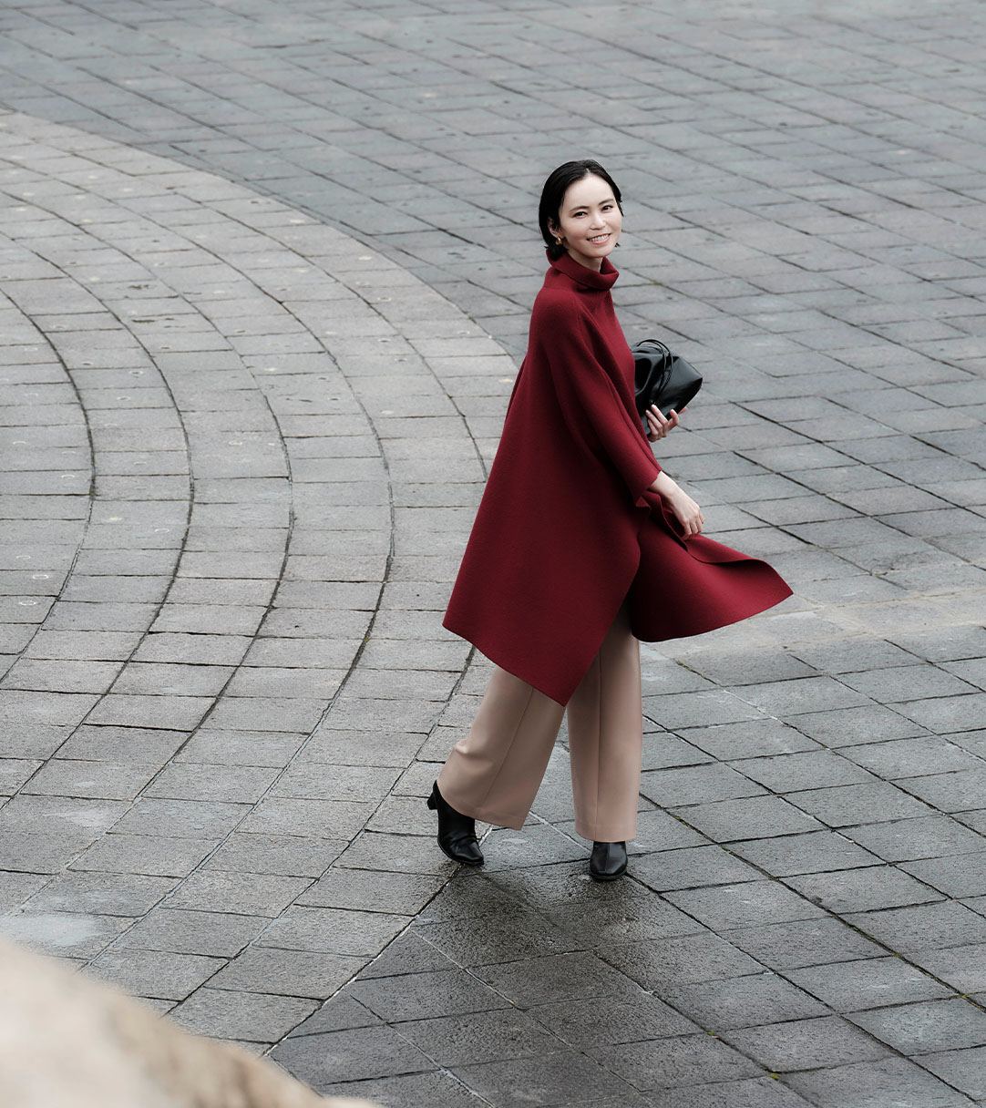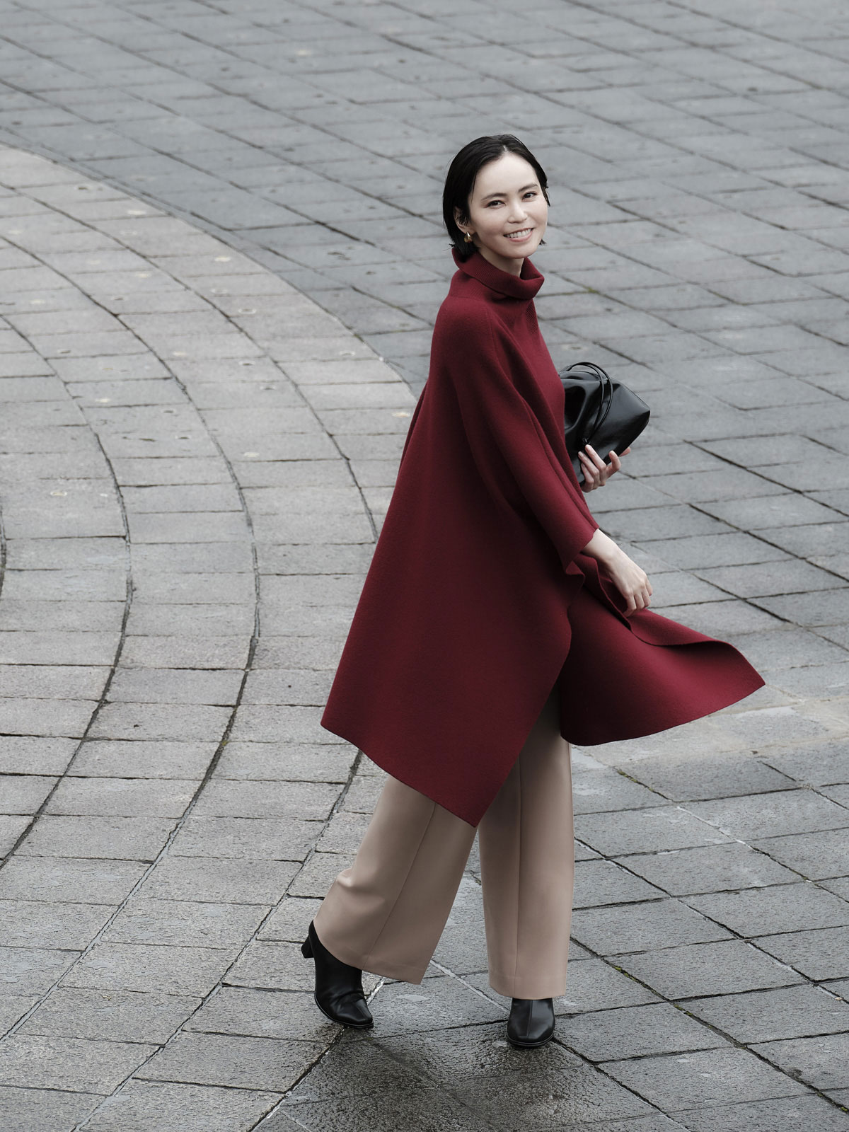 着用したときに、ボディラインに優しく沿うように落ちるシルエットにこだわったポンチョ。動きに合わせて踊るようにひらめき、秋の装いをドラマティックに彩る。